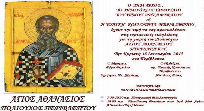 Ο Δήμαρχος, το Δημοτικό Συμβούλιο του Δήμου Ρήγα Φεραίου και η Τοπική Κοινότητα Περιβλέπτου, έχουν την τιμή να σας προσκαλέσουν στις εορταστικές