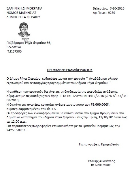 Οι προσφορές των ενδιαφερομένων θα κατατίθενται στο Τμήμα Προμηθειών στο Δημοτικό κατάστημα του Δήμου Ρήγα Φεραίου έως την Τρίτη, 11/10/2016 και έως τις 12:00 μ.μ..