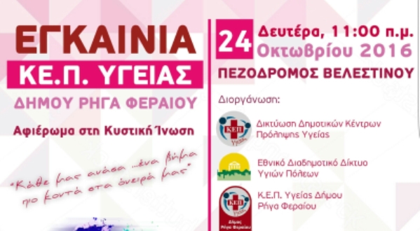 Την Δευτέρα 24 Οκτωβρίου και ώρα 11:00 π.μ. στο πεζόδρομο του Βελεστίνου μπροστά από το δημαρχείο θα πραγματοποιηθούν τα εγκαίνια του ΚΕΠ Υγείας του δήμου Ρήγα Φεραίου. Η νέα αυτή πρωτοποριακή δομή, η οποία πηγάζει από το Εθνικό Διαδημοτικό Δίκτυο Υγειών Πόλεων, θα συμβάλει στην ευαισθητοποίηση και κινητοποίηση του δημότη στην πρόληψη. Στόχος του ΚΕΠ Υγείας είναι η δημιουργία και η δικτύωση της ανάπτυξης προγραμμάτων πρόληψης και προαγωγής της υγείας. Μέσα από τα πρωτόκολλα διαδικασιών προληπτικής ιατρικής προς τους πολίτες για την έγκαιρη διάγνωση σοβαρών και συχνών νοσημάτων, όπως α) ανεύρυσμα κοιλιακής αορτής β) καρδιαγγειακός κίνδυνος γ) καρκίνος του παχέος εντέρου δ) καρκίνος του μαστού ε) καρκίνος του προστάτη στ) καρκίνος του τραχήλου της μήτρας ζ) μελάνωμα, ο δημότης θα μπορεί να προλαμβάνει σοβαρές ασθένειες που θα μπορούσαν να αποβούν μοιραίες για την ζωή του. Επίσης, θα πραγματοποιούνται δράσεις-ενημέρωσης για μια σειρά θεμάτων που εμπίπτουν σε ζητήματα πρόληψης σοβαρών και μη ασθενειών σε όλο το ηλικιακό φάσμα των δημοτών. Σε απόλυτη συνεργασία με την πέμπτη υγειονομική περιφέρεια Θεσσαλίας και το κέντρο υγείας Βελεστίνου θα δημιουργηθούν εκείνες οι προοπτικές αναβάθμισης της ποιότητας παρεχόμενων υπηρεσιών υγείας προς τον δημότη. Σημειώνουμε πως η τελετή εγκαινίων είναι αφιερωμένη στην νόσο της κυστικής ίνωσης, όπου και θα αναφερθούν σε αυτή ο καθηγητής πνευμονολογίας του Πανεπιστημίου Θεσσαλίας κ Κ.Ι Γουργουλιάνης καθώς και η συνδημότισσα μας Πολυχρόνη Ελένη φοιτήτρια του παιδαγωγικού τμήματος Δημοτικής εκπαίδευσής Πανεπιστημίου Θεσσαλίας. Ιδιαίτερη αξία στην όλη εκδήλωση θα δώσουν οι μαθητές του Γυμνασίου, Λυκείου και Ε.Π.Α.Λ Βελεστίνου όπου στα πλαίσια της Πανελλήνιας ημέρας σχολικού αθλητισμού θα κλείσουν με διαδραστικό τρόπο την τελετή των εγκαινίων με το δικό τους μοναδικό τρόπο στο εθνικό στάδιο Βελεστίνου. Η τελετή εγκαινίων θα πραγματοποιηθεί υπό την αιγίδα της Περιφέρειας Θεσσαλίας ενώ την στήριξη τους στην διοργάνωση- με την ευγενική τους χορηγία -προσφέρουν οι : Γενική κλινική Βόλου ‘ΑΝΑΣΣΑ’, το πρότυπο διαγνωστικό κέντρο ‘ΙΑΤΡΙΚΗ ΑΠΕΙΚΟΝΙΣΗ’ και το κέντρο φυσικής ιατρικής και αποκατάστασης ‘ΚΕΝΤΑΥΡΟΣ’. Μετά το πέρας της τελετής εγκαινίων θα ακολουθήσει μπουφές.