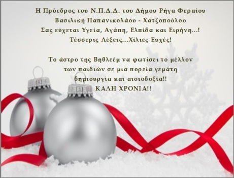 Ευχές για τη νέα χρονιά της Προέδρου του Ν.Π.Δ.Δ. του Δήμου Ρήγα Φεραίου κα. Βασιλική Παπανικολάου – Χατζοπούλου 28 December 2016 by internet_office 0 About internet_office