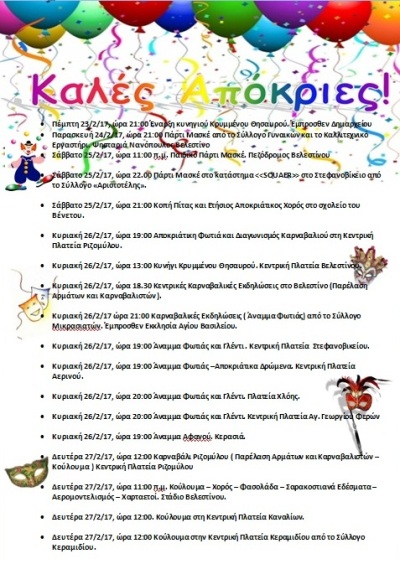 • Κυριακή 26/2/17, ώρα 19:00 Αποκριάτικη Φωτιά και Διαγωνισμός Καρναβαλιού στη Κεντρική Πλατεία Ριζομύλου.