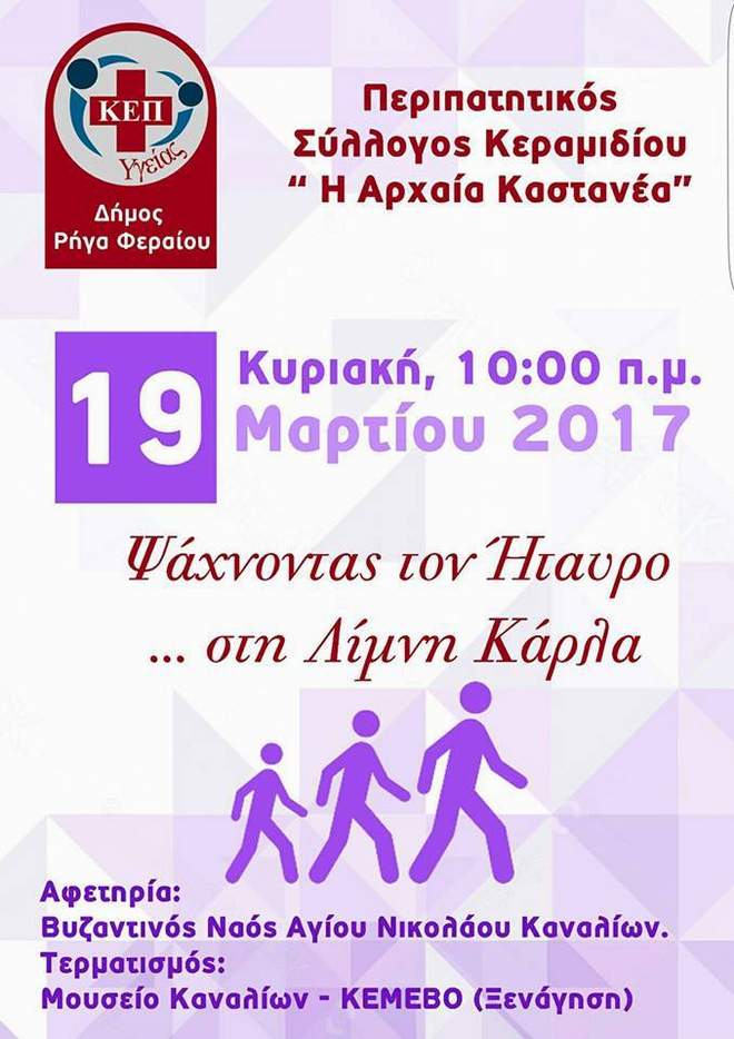 Το ΚΕ.Π. Υγείας του Δήμου Ρήγα Φεραίου προσκαλεί τους δημότες την Κυριακή 19 Μαρτίου 2017 και ώρα 10:00π.μ στο Βυζαντινό Ναό Αγίου Νικολάου, στην είσοδο των Καναλίων, να διανύσουμε μία απόσταση 12 χιλιομέτρων «ψάχνοντας τον Ήταυρο στην λίμνη Κάρλα».