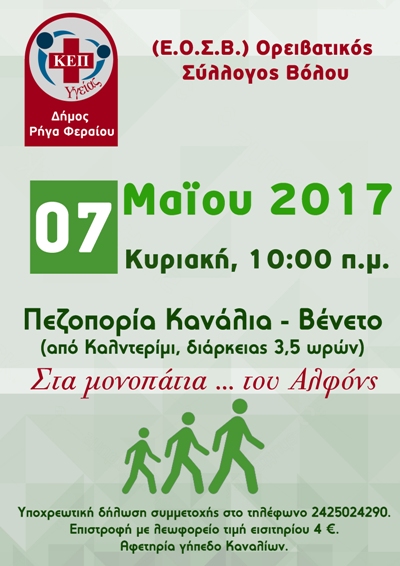 Το ΚΕ.Π.Υγείας του Δήμου Ρήγα Φεραίου σε συνεργασία με τον Ορειβατικό Σύλλογο Βόλου (Ε.Ο.Σ.) διοργανώνουν πεζοπορία σε ένα όμορφο καλντερίμι που ξεκινά από το μετόχι Καναλίων, φτάνει στην κορυφογραμμή της άνω Κερασιάς για να καταλήξει στο Βένετο σε μια πανέμορφη διαδρομή με πυκνή βλάστηση αγναντεύοντας από ψηλά το Αιγαίο.