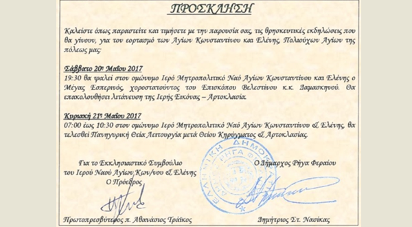 Πρόσκληση στις εορταστικές εκδηλώσεις για τον εορτασμό των Αγίου Κωνσταντίνου και Ελένης 18 May 2017 by internet_office 0 About internet_office