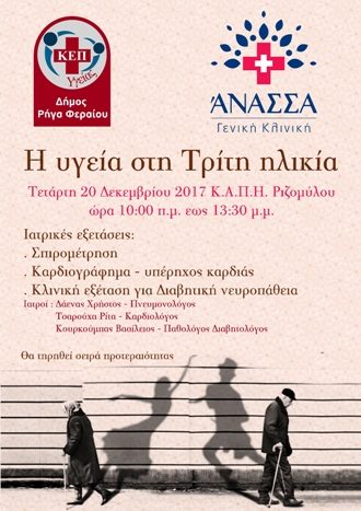 Συνεχίζοντας την εκστρατεία πρόληψης ενημέρωσης και ευαισθητοποίησης των δημοτών σε θέματα υγείας, το ΚΕ.Π Υγείας πραγματοποιεί σε συνεργασία με την γενική κλινική του Βόλου ‘ΑΝΑΣΣΑ’ την Τετάρτη 20 Δεκεμβρίου στο χώρο του ΚΑ.ΠΗ Ριζομύλου προληπτικό έλεγχο υγείας στους ηλικιωμένους της περιοχής από τις 10.00 π.μ. έως και τις 13.30.