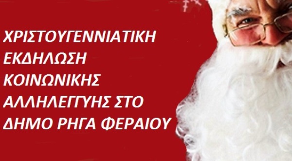 Την Κυριακή 17 Δεκεμβρίου 2017 και ώρα 18.00 στο Πνευματικό κέντρο του Βελεστίνου θα πραγματοποιηθεί χριστουγεννιάτικη εκδήλωση κοινωνικής αλληλεγγύης με συμμετοχή πολιτιστικών συλλόγων του Δήμου του Ρήγα Φεραίου για την ενίσχυση του Κοινωνικού Παντοπωλείου και Φαρμακείου του Δήμου.