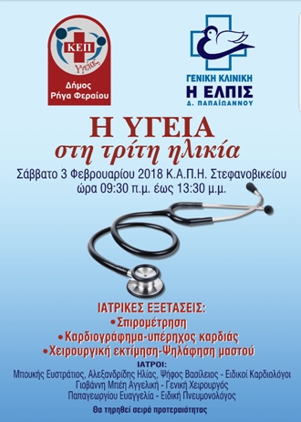 Το 2018 αποτελεί έτος αφιερωμένο στους ηλικιωμένους του Δήμου Ρήγα Φεραίου από το ΚΕ.Π. Υγείας του Δήμου. Συνεχίζοντας την εκστρατεία πρόληψης, ενημέρωσης και ευαισθητοποίησης των δημοτών σε θέματα υγείας, το ΚΕ.Π. Υγείας πραγματοποιεί σε συνεργασία με την γενική κλινική «Η Ελπίς», το Σάββατο 3 Φεβρουαρίου 2018 στο χώρο του ΚΑ.ΠΗ Στεφανοβικείου προληπτικό έλεγχο υγείας στους ηλικιωμένους της περιοχής από τις 09:30 έως και τις 13.30. Στόχος της δράσης είναι η στήριξη της υγείας των ηλικιωμένων συνδημοτών. Μην ξεχνάμε πως  στα πλαίσια της οικονομικής κρίσης παρατηρείται το φαινόμενο αρκετά ζευγάρια να επιστρέφουν στην «πατρική» αγκαλιά των γονιών τους ώστε με την στήριξη τους να μπορέσουν να φροντίσουν τα υπόλοιπα μέλη της οικογένειας τους. Οι ηλικιωμένοι είναι αυτοί που συμπαραστέκονται σήμερα είτε με οικονομική στήριξη, είτε με τη φιλοξενία των παιδιών τους και την κάλυψη των αναγκών των εγγονιών τους αλλά ακόμη και με την ψυχική τους ανάταση, για να μπορέσουν να αντιμετωπίσουν τις δυσκολίες της σύγχρονης εποχής.  Αξίζει  η επιπλέον φροντίδα από μας για τα όσα έχουν προσφέρει.