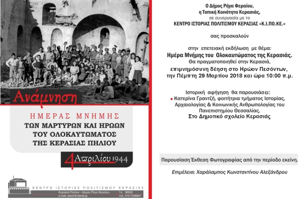 Πρόσκληση στην "Ημέρα Μνήμης του Ολοκαυτώματος της Κερασιάς" την Πέμπτη 29 Μαρτίου 2018 και ώρα 10:00π.μ.