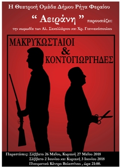 Την κωμωδία των Αλ. Σακελλάριου και Χρ. Γιαννακόπουλου «Μακρυκωσταίοι και Κοντογιώργηδες» παρουσιάζει η Θεατρική ομάδα Δήμου Ρήγα Φεραίου «Αειράνη».