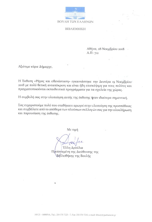 Ευχαριστήρια επιστολή στον Δήμαρχο Ρήγα Φεραίου, κ. Δημήτρη Νασίκα απέστειλε η Προϊσταμένη της Βιβλιοθήκης της Βουλής, κα. Έλλη Δρούλια σχετικά με την συμβολή του Δήμου στην Έκθεση για το Ρήγα Βελεστινλή.