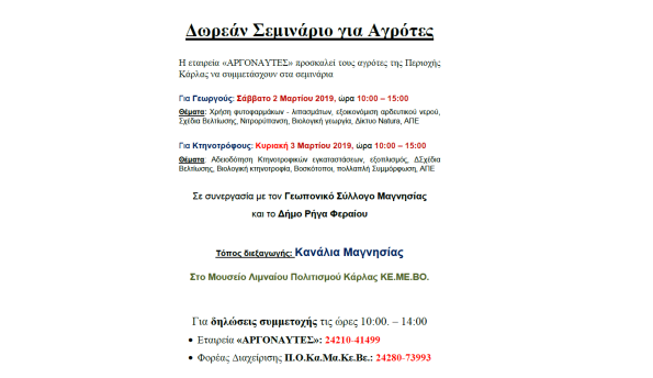 Περιλαμβάνει πλήθος και ποικιλία δράσεων κοίτα: www.karlaschool.gr. To Σαββατοκύριακο 3 και 4 Μαρτίου, θα πραγματοποιηθεί ο δεύτερος κύκλος  δωρεάν Σεμιναρίων για 50 αγρότες (γεωργούς και κτηνοτρόφους) αναλυτικά ως εξής: