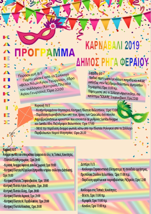 - Παιδικό πάρτυ μασκέ με κλόουν,παιχνίδια και πολλές εκπλήξεις στον Πεζόδρομο Βελεστίνου, (έμπροσθεν δημαρχείου), Ώρα 11:00π.μ.