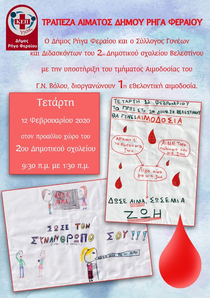 Ο Δήμος Ρήγα Φεραίου στο πλαίσιο της κοινωνικής πολιτικής του, δημιούργησε και λειτουργεί πλέον την δική του Δημοτική Τράπεζα Αίματος σε συνεργασία με το Γενικό Νοσοκομείο Βόλου για την κάλυψη των αναγκών σε μονάδες αίματος των εθελοντών αιμοδοτών, κατοίκων και δημοτών.