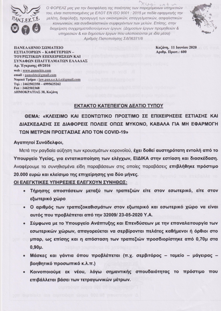 Το τμήμα Τοπικής Οικονομικής Ανάπτυξης Δήμου Ρήγα Φεραίου, παραθέτει σχετικό έγγραφο (Έκτακτο κατεπείγον δελτίο τύπου) του «ΠΑΝΕΛΛΗΝΙΟΥ ΣΩΜΑΤΙΟΥ ΕΣΤΙΑΤΟΡΙΩΝ – ΚΑΦΕΤΕΡΕΙΩΝ – ΤΟΥΡΙΣΤΙΚΩΝ ΕΠΙΧΕΙΡΗΣΕΩΝ ΚΑΙ ΣΥΝΑΦΩΝ ΕΠΑΓΓΕΛΜΑΤΩΝ ΕΛΛΑΔΑΣ» με θέμα ” Κλείσιμο και εξοντωτικό πρόστιμο σε επιχειρήσεις εστίασης και διασκέδασης σε διάφορες πόλεις για μή εφαρμογή των μέτρων προστασίας από τον COVID-19’’, προς γνώση των επαγγελματιών του Δήμου μας.