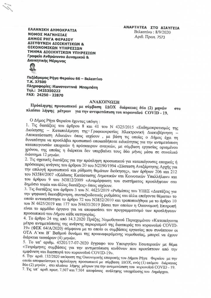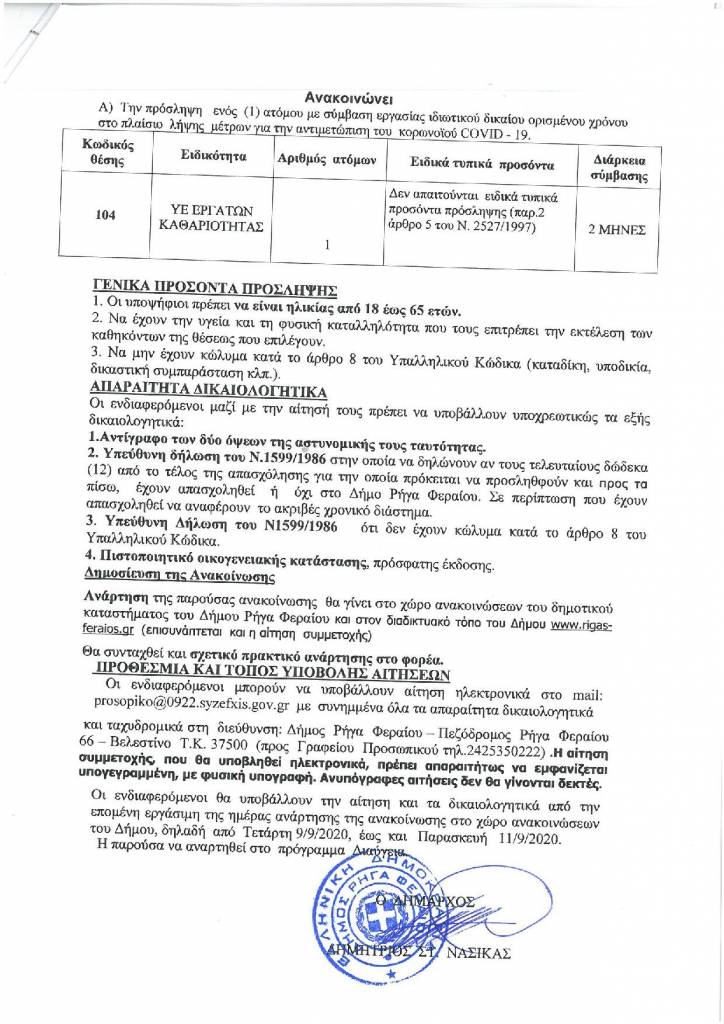 ΑΝΑΚΟΙΝΩΣΗ ΠΡΟΣΛΗΨΗΣ ΕΝΟΣ (1) ΑΤΟΜΟΥ ΛΟΓΩ COVID-19 ΣΤΗΝ ΚΑΘΑΡΙΟΤΗΤΑ ΜΕ 2-ΜΗΝΗ ΣΥΜΒΑΣΗ 8 September 2020 by internet_office 0 About internet_office
