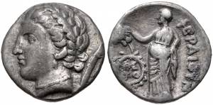 Νόμισμα των αρχαίων Φερών. Στη μία όψη η Θεά Ενοδία. Στην άλλη όψη η νύμφη Υπέρεια που ακουμπάει τον κρουνό σε σχήμα λεοντοκεφαλής της Υπέρειας Κρήνης.
