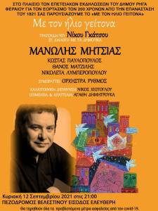 ΚΥΡΙΑΚΗ 12 ΣΕΠΤΕΜΒΡΙΟΥ 2021 ΣΤΙΣ 21:00, ΕΠΕΤΕΙΑΚΕΣ ΕΚΔΗΛΩΣΕΙΣ ΔΗΜΟΥ ΡΗΓΑ ΦΕΡΑΙΟΥ 2021 ΓΙΑ ΤΑ 200 ΧΡΟΝΙΑ ΑΠΟ ΤΗΝ ΕΛΛΗΝΙΚΗ ΕΠΑΝΑΣΤΑΣΗ 6 September 2021 by internet_office 0 About internet_office