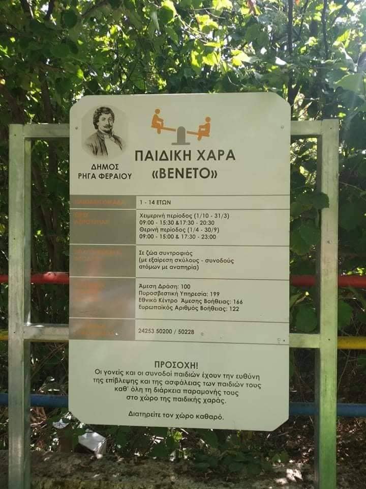Η Τεχνική Υπηρεσία του Δήμου Ρήγα Φεραίου με συνέπεια και υπευθυνότητα προς αποφυγή οποιουδήποτε προβλήματος και ατυχήματος με την παράδοση των παιδικών χαρών έχει προβεί σε όλες τις απαραίτητες και προβλεπόμενες ενέργειες για την ύπαρξη πιστοποιητικού προδιαγραφών. Συγκεκριμένα, έχει συντάξει τα απαιτούμενα σχέδια για την ακριβή τοποθέτηση των παιχνιδιών και οργάνων, τι διαστάσεις τους, τις αποστάσεις που πρέπει να υπάρχουν μεταξύ τους, τον διατιθέμενο ελεύθερο χώρο γύρω από κάθε παιχνίδι, προκειμένου να αποφεύγεται η διασταυρούμενη πορεία των παιδιών.