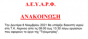 ΑΝΑΚΟΙΝΩΣΗ ΔΙΑΚΟΠΗΣ ΝΕΡΟΥ ΤΗΝ ΔΕΥΤΕΡΑ 8 ΝΟΕΜΒΡΙΟΥ 2021 ΣΤΗΝ Τ.Κ. ΑΕΡΙΝΟΥ ΑΠΟ ΤΙΣ 08:00 ΕΩΣ ΤΙΣ 13:30 5 November 2021 by internet_office 0 About internet_office