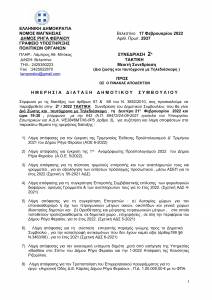 ΠΡΟΣΚΛΗΣΗ ΣΤΗΝ 2Η/2022 ΤΑΚΤΙΚΗ ΣΥΝΕΔΡΙΑΣΗ ΤΟΥ ΔΗΜΟΤΙΚΟΥ ΣΥΜΒΟΥΛΙΟΥ, ΔΕΥΤΕΡΑ 21 ΦΕΒΡΟΥΑΡΙΟΥ 2022 ΚΑΙ ΩΡΑ 19:30 17 February 2022 by internet_office 0 About internet_office