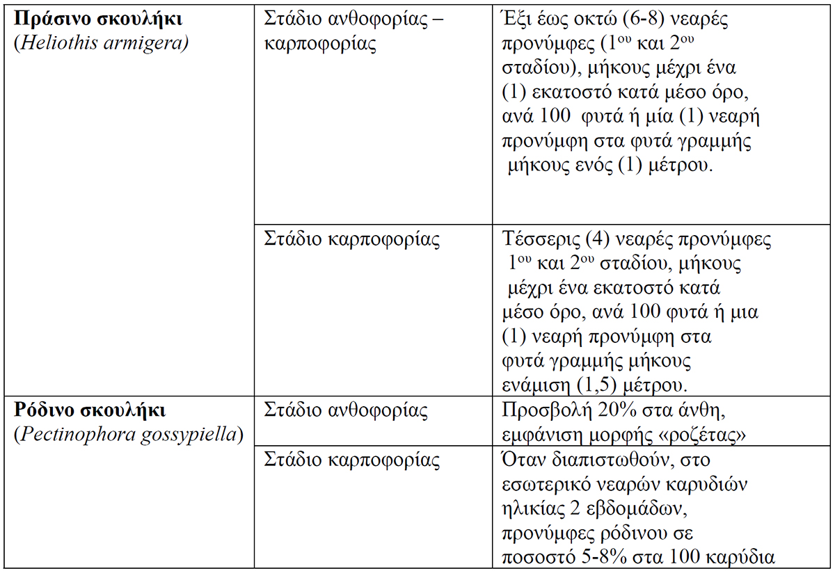 Οι συλλήψεις ενήλικων (πεταλούδων) ατόμων πράσινου και ρόδινου σκουληκιού στις  φερομονικές παγίδες που έχουν τοποθετηθεί τόσο από τους ίδιους τους παραγωγούς όσο και από την Υπηρεσία μας, δεν αποτελούν κριτήριο για την εφαρμογή χημικής επέμβασης αλλά εργαλείο πρόγνωσης του κινδύνου προσβολής στον αγρό από πράσινο ή ρόδινο σκουλήκι. Η σοβαρότητα της προσβολής με σκοπό την άμεση λήψη ή μη μέτρων αντιμετώπισης εξαρτάται τόσο από τον αριθμό και την ηλικία των ζωντανών προνυμφών (σκουληκιών) που διαπιστώνονται στον αγρό, όσο και από το στάδιο ανάπτυξης της καλλιέργειας. Σε κάθε περίπτωση κριτήριο για την λήψη ή όχι μέτρων αντιμετώπισης είναι μόνο τα αποτελέσματα των επιτόπιων δειγματοληψιών στα βλαστικά όργανα των φυτών (χτένια, άνθη, καρύδια).