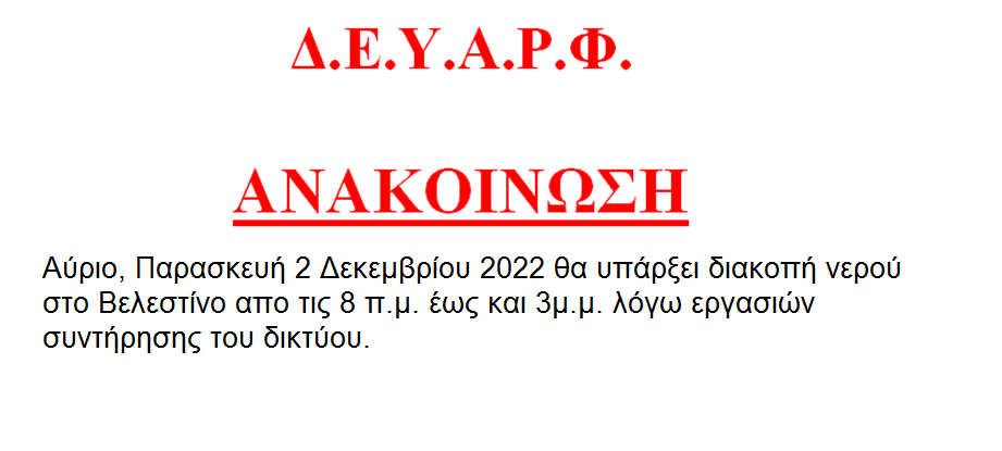 ΠΑΡΑΣΚΕΥΗ 2 ΔΕΚΕΜΒΡΙΟΥ 2022 – ΔΙΑΚΟΠΗ ΝΕΡΟΥ ΣΤΟ ΒΕΛΕΣΤΙΝΟ 8π.μ. ΕΩΣ ΚΑΙ 3μ.μ. 1 December 2022 by internet_office 0 More info