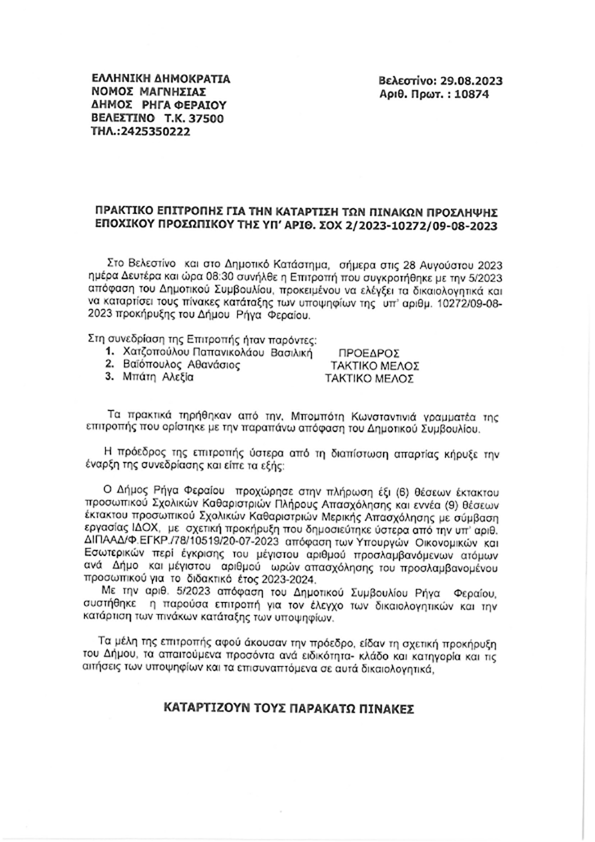 ΠΡΑΚΤΙΚΟ ΕΠΙΤΡΟΠΗΣ ΓΙΑ ΤΗΝ ΚΑΤΑΡΤΙΣΗ ΤΩΝ ΠΙΝΑΚΩΝ ΠΡΟΣΛΗΨΗΣ ΕΠΟΧΙΚΟΥ ΠΡΟΣΩΠΙΚΟΥ ΤΗΣ ΥΠ’ ΑΡΙΘ. ΣΟΧ 2/2023-10272/09-08-2023 29 August 2023 by User 0 About User
