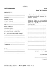 ΠΑΡΑΚΑΤΩ ΘΑ ΒΡΕΙΤΕ ΤΗΝ ΑΙΤΗΣΗ ΓΙΑ ΤΗΝ ΔΙΕΝΕΡΓΕΙΑ ΑΥΤΟΨΙΑΣ ΑΠΟ ΚΛΙΜΑΚΙΟ ΤΟΥ ΔΗΜΟΥ ΡΗΓΑ ΦΕΡΑΙΟΥ ΓΙΑ ΟΣΕΣ ΚΑΤΟΙΚΙΕΣ / ΕΠΙΧΕΙΡΗΣΕΙΣ ΕΧΟΥΝ ΠΛΗΓΕΙ ΑΠΟ ΤΗΝ ΠΛΥΜΜΗΡΑ (ΚΑΚΟΚΑΙΡΙΑ DANIEL) ΤΗΣ 5ΗΣ ΣΕΠΤΕΜΒΡΙΟΥ 2023.