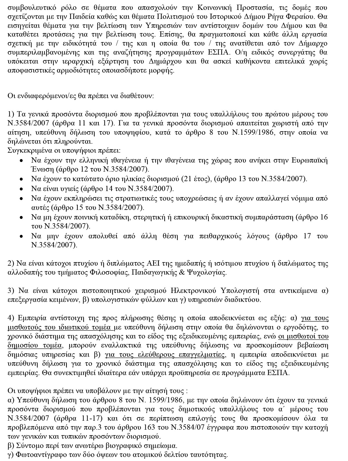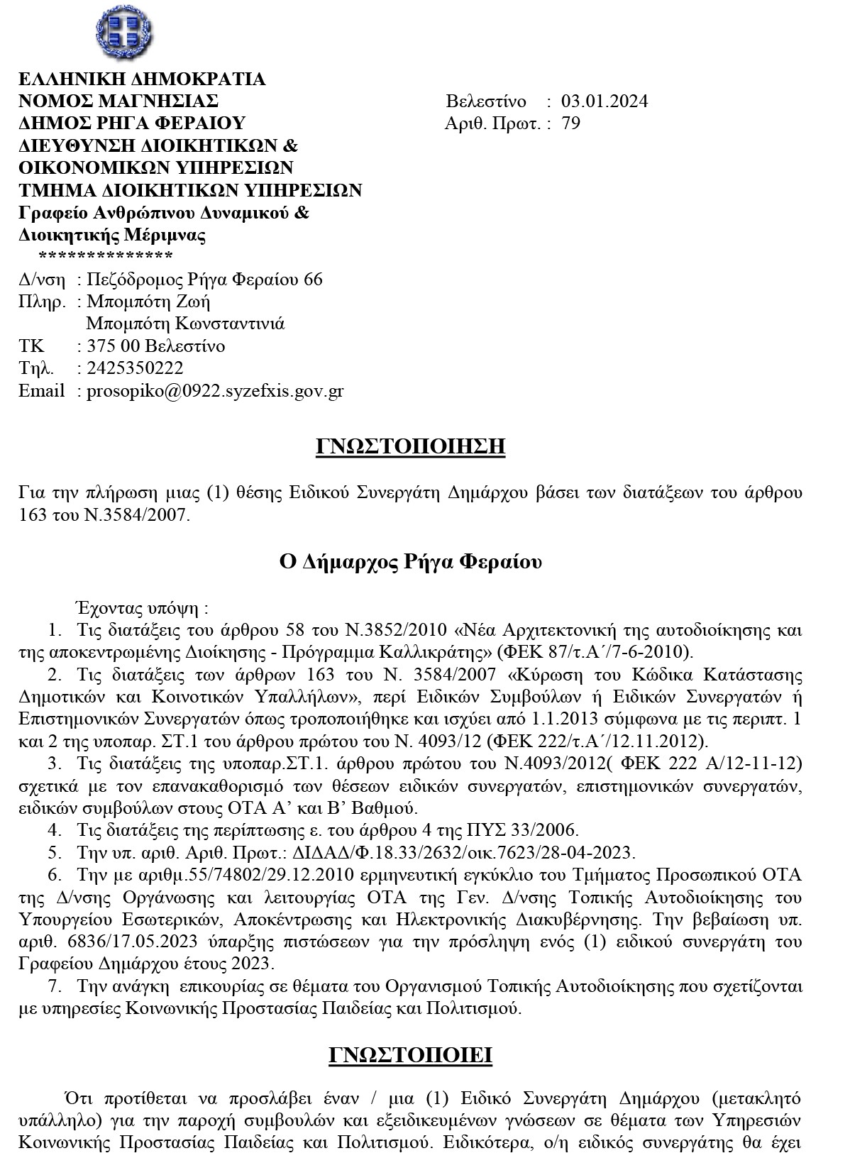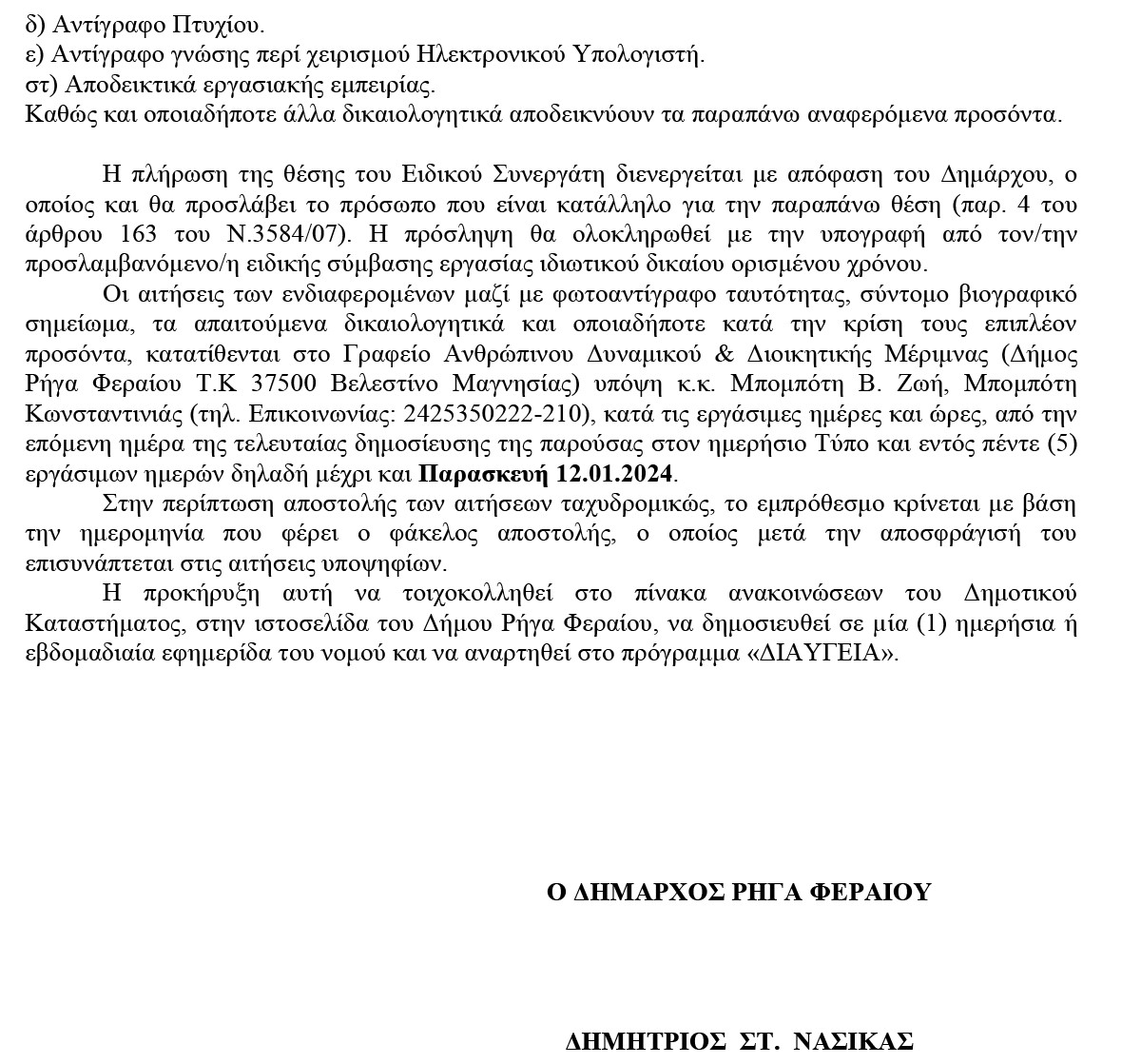 Ανακοίνωση – γνωστοποίηση για την πλήρωση µιας (1) θέσης Ειδικού Συνεργάτη Δημάρχου 4 January 2024 by User 0 About User