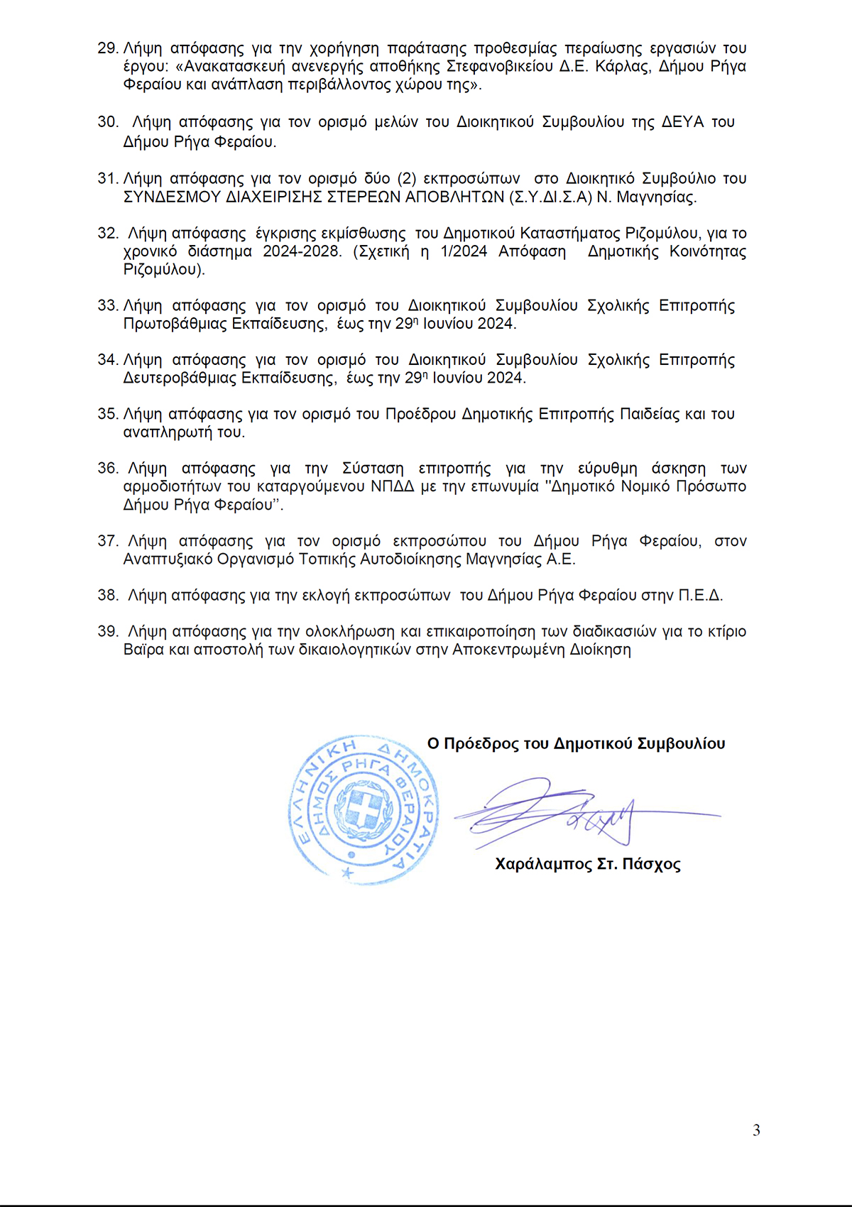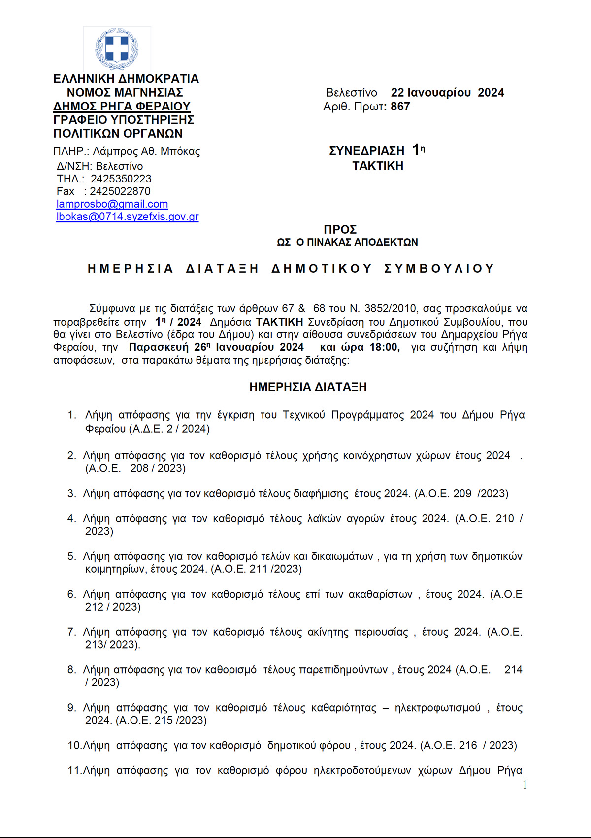 Πρόσκληση στην 1η Τακτική Συνεδρίαση του Δημοτικού Συμβουλίου