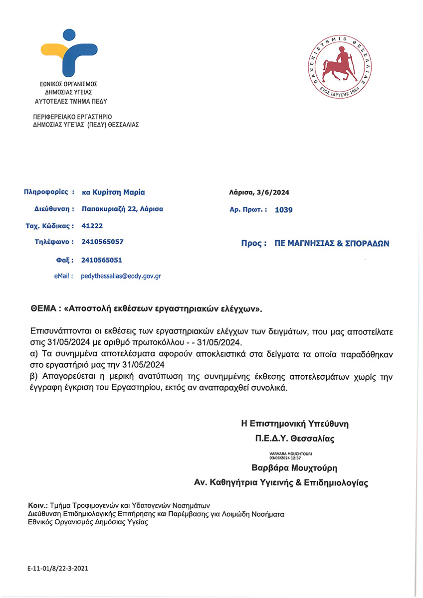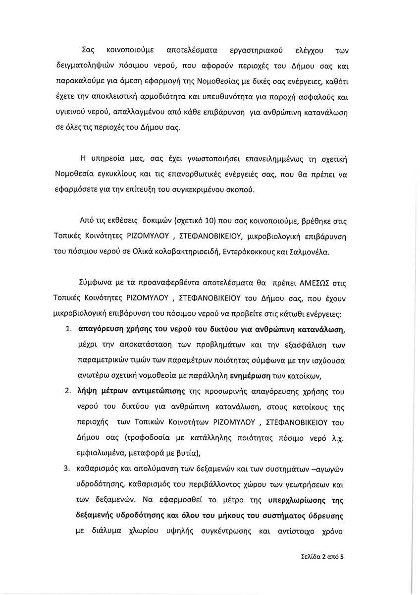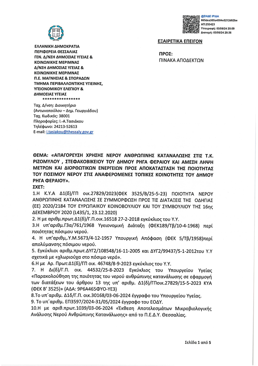 H Διεύθυνση Υγείας έλαβε δείγματα από τη δεξαμενή και τα δίκτυα ύδρευσης Ριζομύλου και Στεφανοβικείου και μετά   την ολοκλήρωση των αναλύσεων μας απεστάλησαν στις 4/6/2024 και τα γνωστοποιούμε.