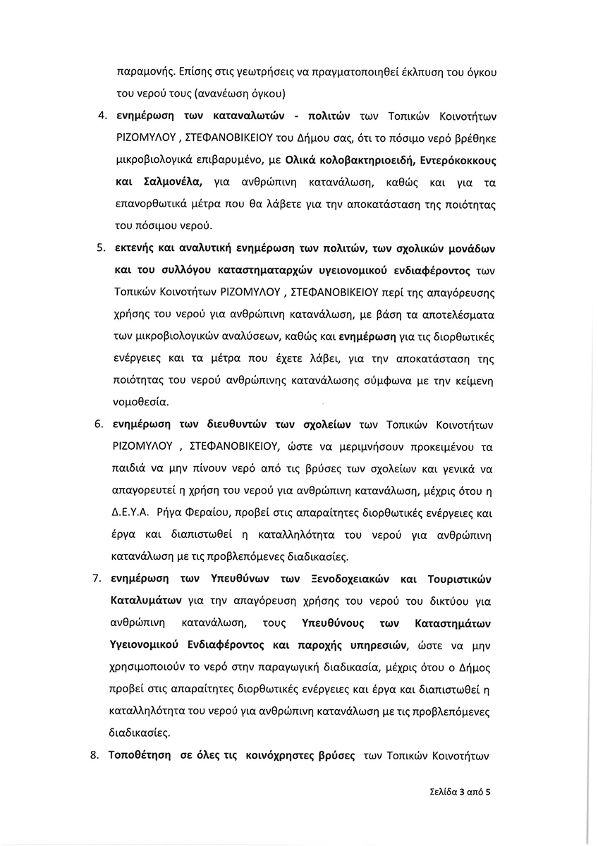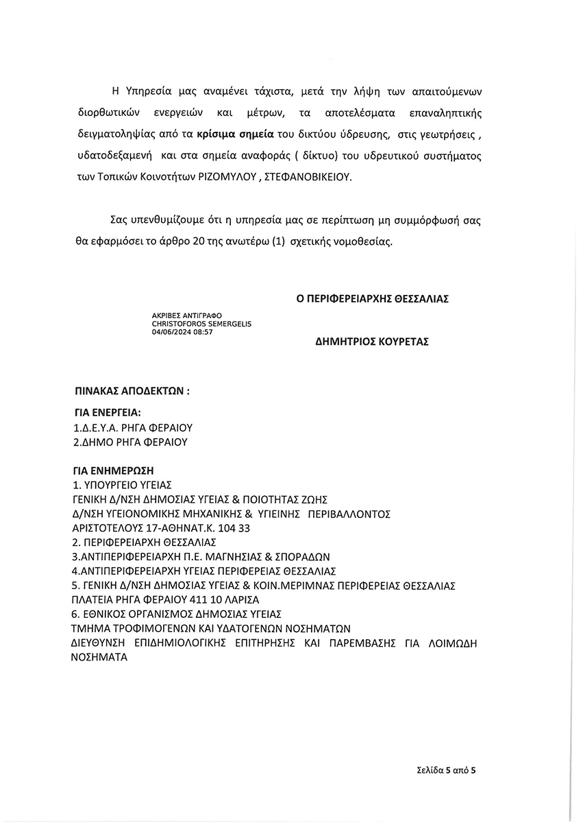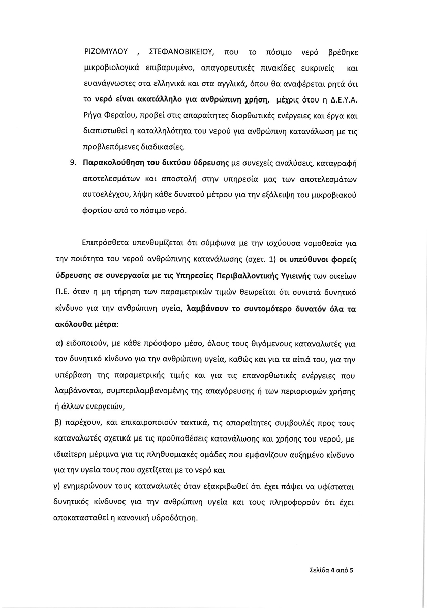 Η ΔΕΥΑ Ρήγα Φεραίου από τη στιγμή που προέκυψε το πρόβλημα με την ποιότητα του νερού στους οικισμούς Ριζομύλου και Στεφανοβικείου βρίσκεται σε συνεχή επαφή με τον ΕΟΔΥ και τη Διεύθυνση Υγείας  και ακολουθεί τις υποδείξεις τους.