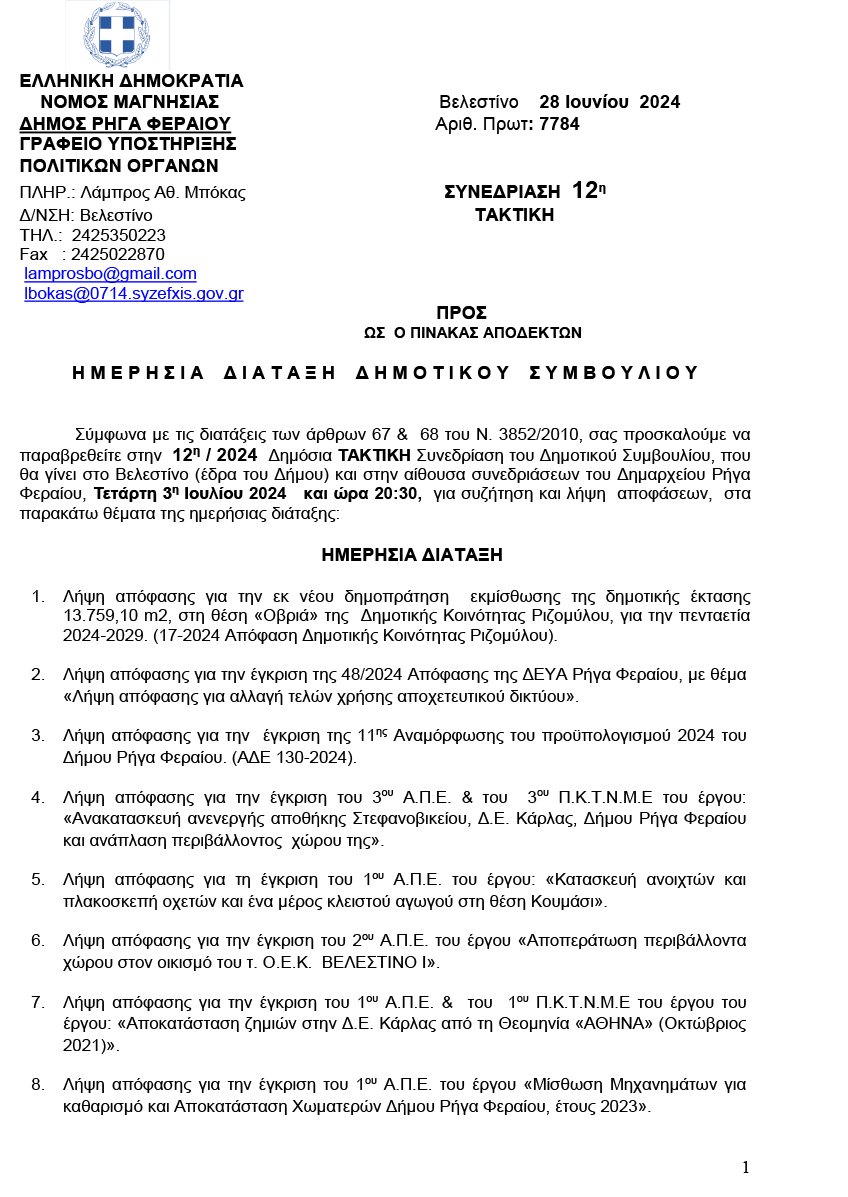 Πρόσκληση για τη 12η / 2024 Δημόσια ΤΑΚΤΙΚΗ Συνεδρίαση του Δημοτικού Συμβουλίου 28 June 2024 by User 0 About User