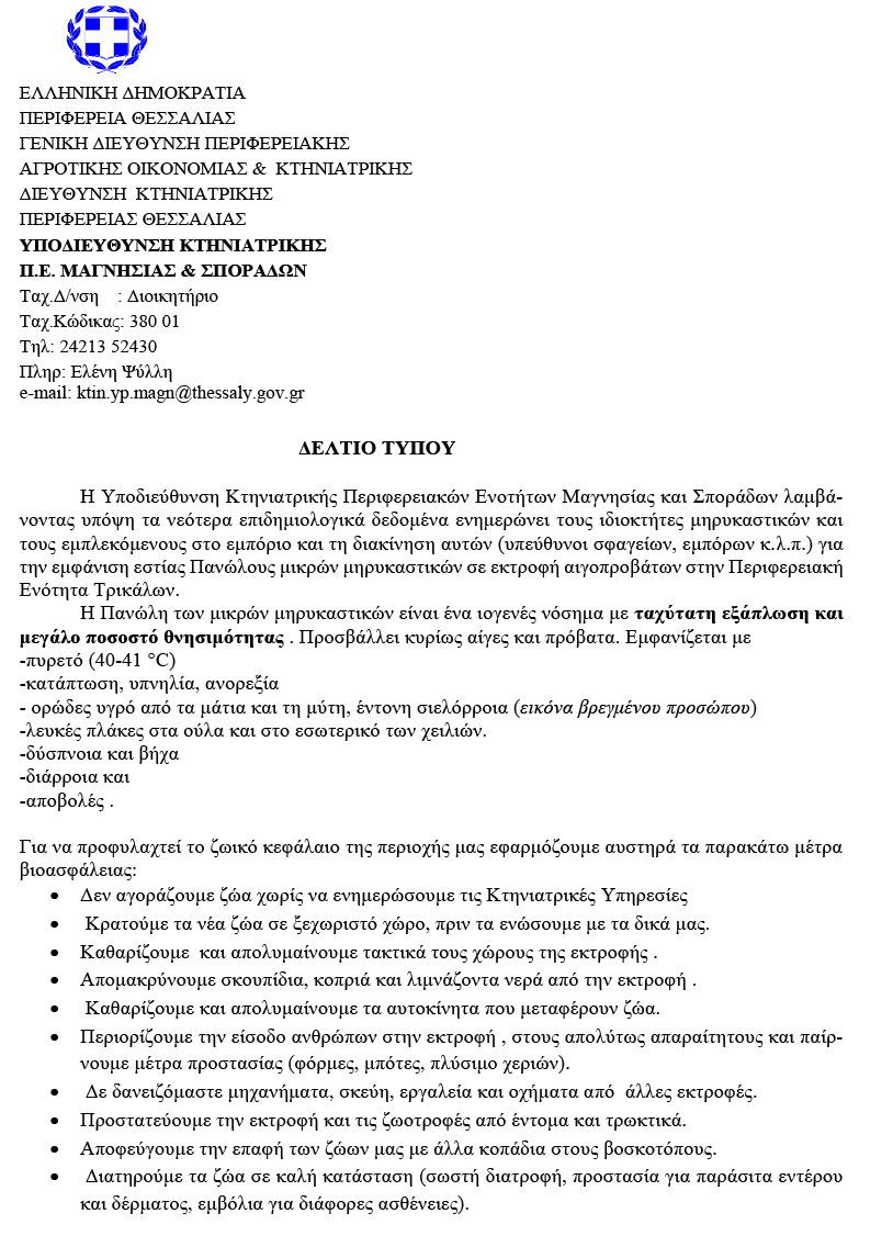 Δελτίο τύπου για πανώλη αιγοπροβάτων