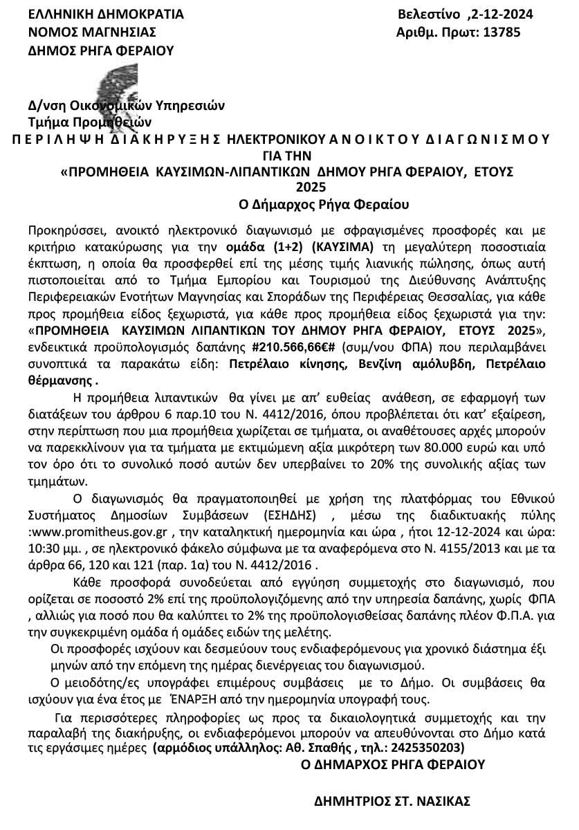 ΠΕΡΙΛΗΨΗ ΔΙΑΚΗΡΥΞΗΣ “ΠΡΟΜΗΘΕΙΑ ΚΑΥΣΙΜΩΝ – ΛΙΠΑΝΤΙΚΩΝ, ΕΤΟΥΣ 2025” 3 December 2024 by User 0 About User