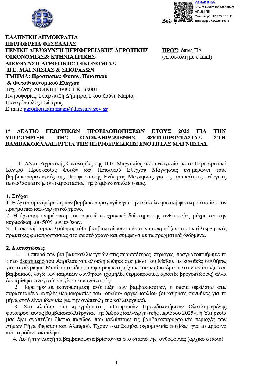 1ο ΔΕΛΤΙΟ ΓΕΩΡΓΙΚΩΝ ΠΡΟΕΙΔΟΠΟΙΗΣΕΩΝ ΕΤΟΥΣ 2025 ΓΙΑ ΤΗΝ ΥΠΟΣΤΗΡΙΞΗ ΤΗΣ ΟΛΟΚΛΗΡΩΜΕΝΗΣ ΦΥΤΟΠΡΟΣΤΑΣΙΑΣ ΣΤΗ ΒΑΜΒΑΚΟΚΑΛΛΙΕΡΓΕΙΑ 10 July 2025 by User 0 About User