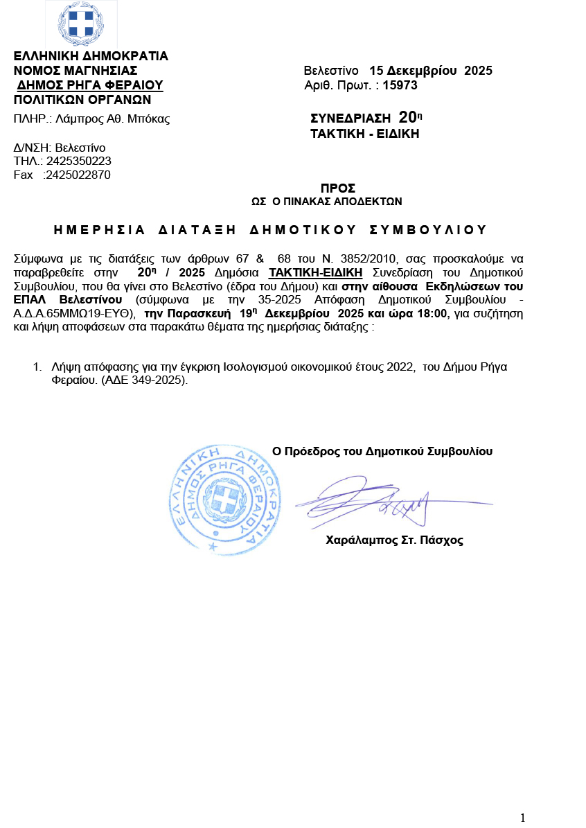 ΠΡΟΣΚΛΗΣΗ ΔΗΜΟΤΙΚΟΥ ΣΥΜΒΟΥΛΙΟΥ ΓΙΑ 20η-2025 ΤΑΚΤΙΚΗ – ΕΙΔΙΚΗ ΣΥΝΕΔΡΙΑΣΗ ΙΣΟΛΟΓΙΣΜΟΣ 2022 ΔΡΦ 15 December 2025 by User 0 About User