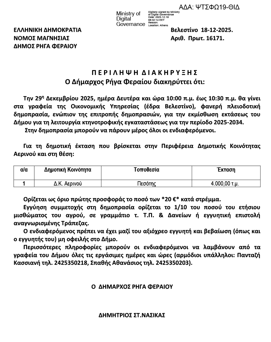 ΠΕΡΙΛΗΨΗ ΔΙΑΚΗΡΥΞΗΣ ΓΙΑ ΣΤΑΒΛΟ-ΠΕΣΟΤΗΣ ΑΕΡΙΝΟΥ