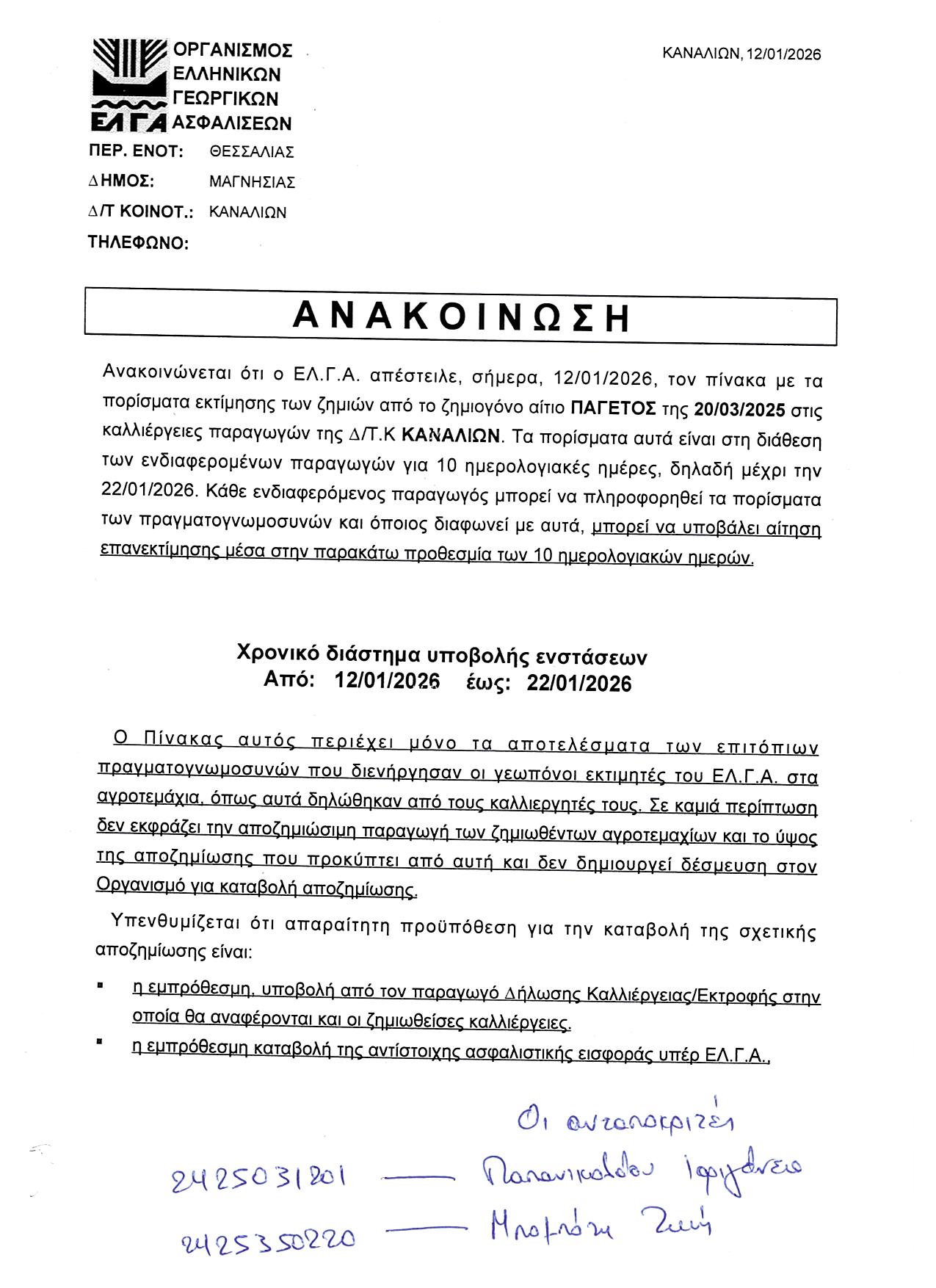 Ανακοίνωση ΕΛΓΑ για πορίσματα ζημιών από παγετό στις καλλιέργειες Καναλίων 13 January 2026 by User 0 About User
