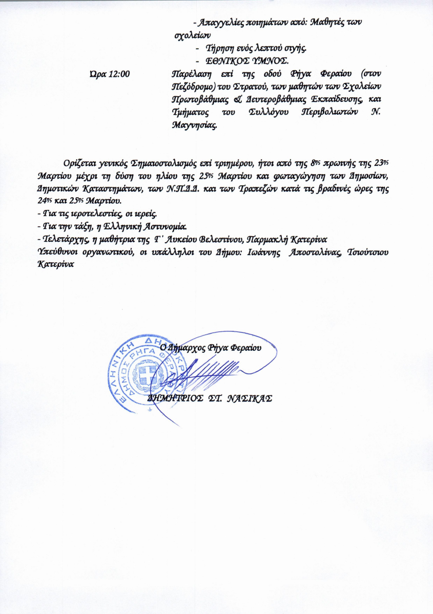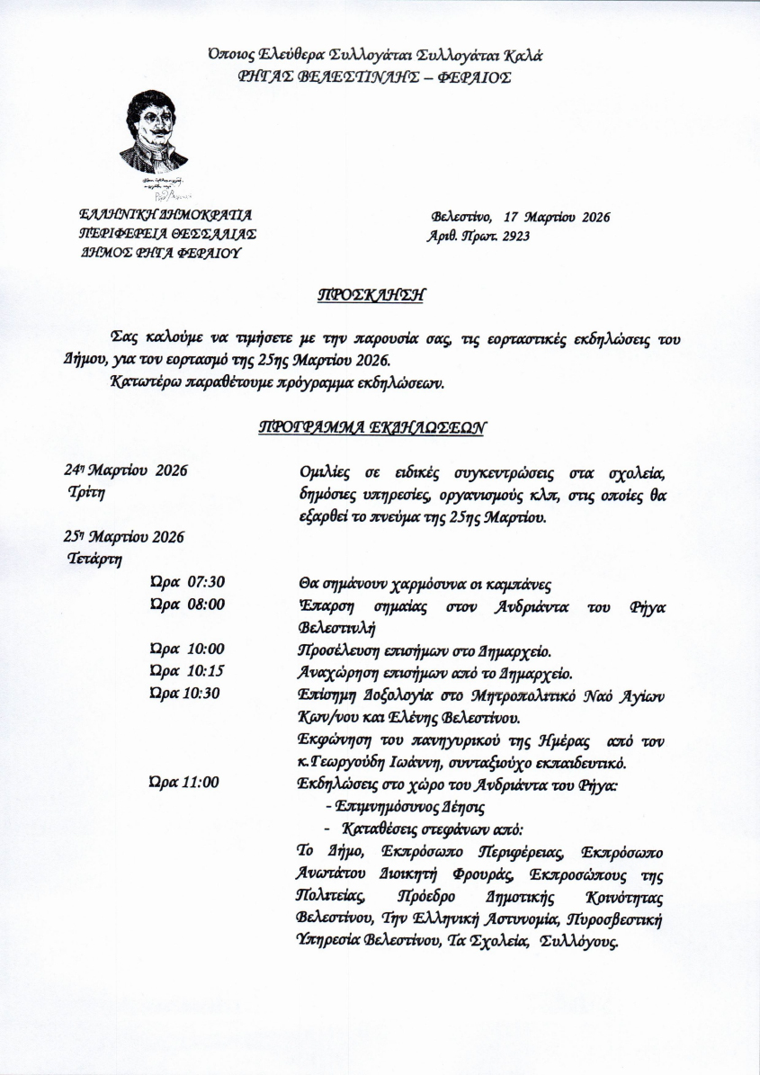 Πρόγραμμα εορταστικών εκδηλώσεων για την 25η Μαρτίου Δήμου Ρήγα Φεραίου