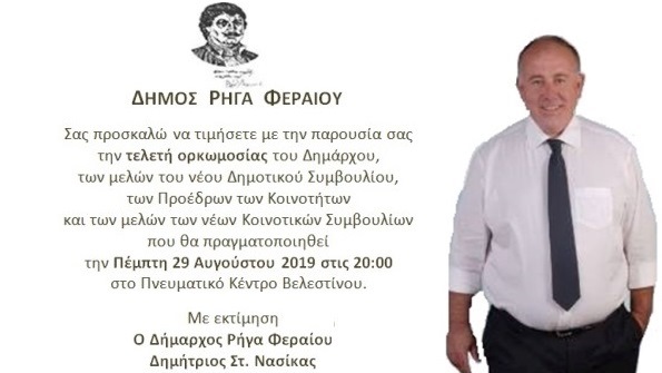 Πρόσκληση τελετή ορκωμοσίας του Δημάρχου, των μελών του νέου Δημοτικού Συμβουλίου, των Προέδρων των Κοινοτήτων και των μελών των νέων Κοινοτικών Συμβουλίων του Δήμου Ρήγα Φεραίου