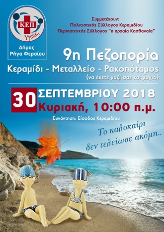 More info9η πεζοπορία διοργανώνει το ΚΕ.Π Υγείας Δήμου Ρήγα Φεραίου την Κυριακή 30 Σεπτεμβρίου στις 10:00 πμ